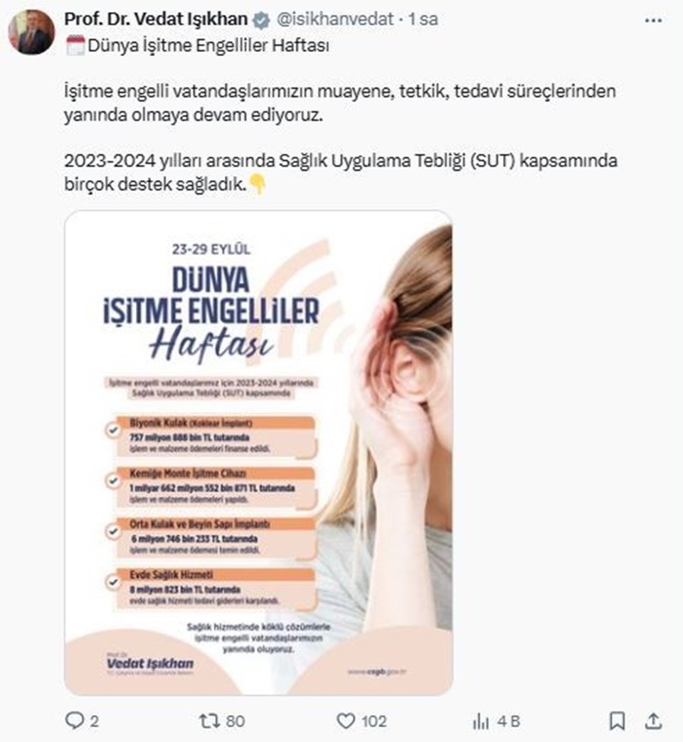 T.C. Çalışma ve Sosyal Güvenlik Bakan Vedat Işıkhan, Uluslararası İşitme Engelliler Haftası ile ilgili paylaşımda bulundu. Işıkhan paylaşımında;